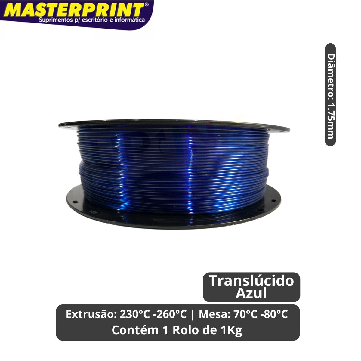 Filamento de Impressora 3D PETG Azul Translúcido 1.75mm 1KG para Impressora 3D Alta Resistência Bom Acabamento Masterprint