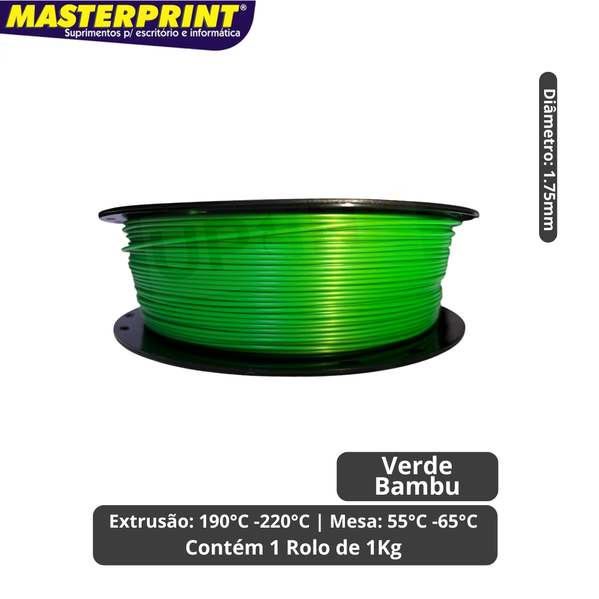 Filamento 3D PLA Verde Bambu 1.75mm 1kg Cor Brilhante Textura Macia Masterprint Filamento 3D