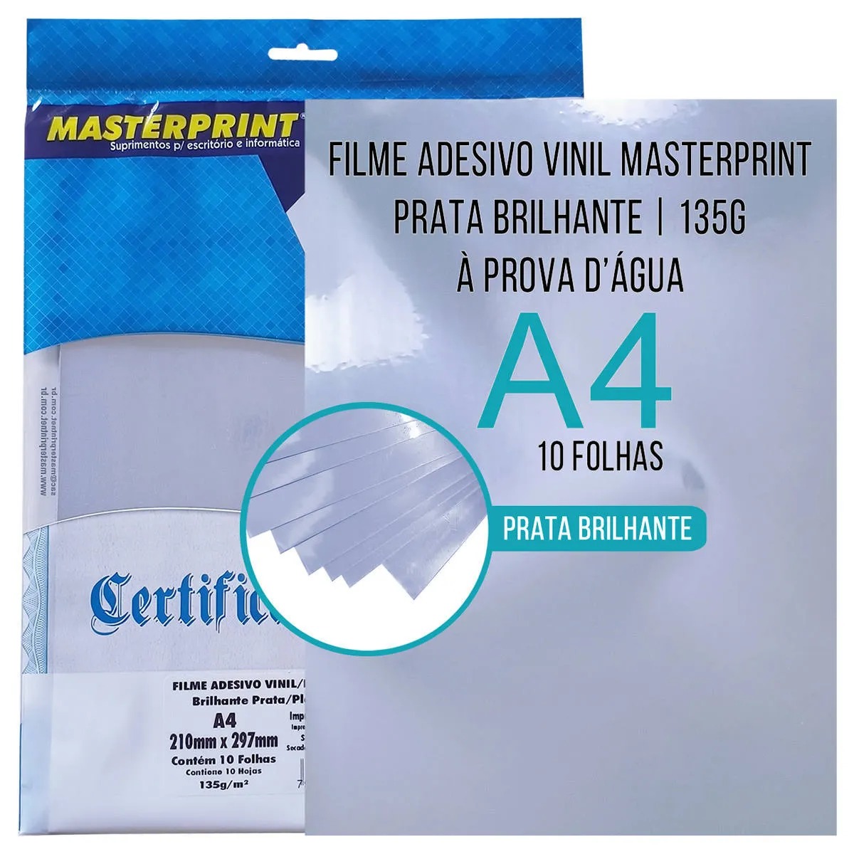 Vinil Adesivo Prata Brilhante A4 135g À Prova D'Água Filme Adesivo PVC com 10 Folhas Masterprint